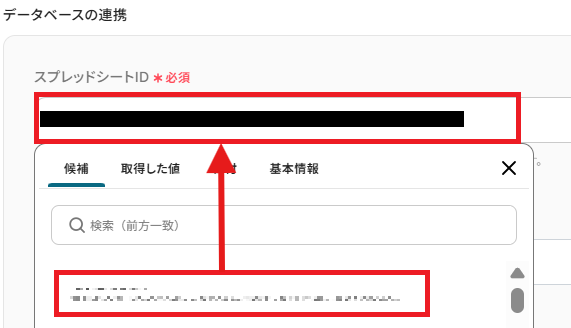 データベースの連携箇所でスプレッドシートID、スプレッドシートのタブ名を候補より入力します。
