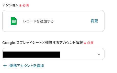 次はGoogleスプレッドシートにレコードを追加していきます。レコードを追加するスプレッドシートを用意したら、「レコードを追加する」をクリックしてください。