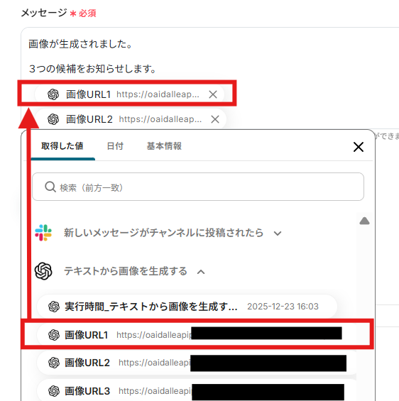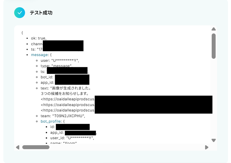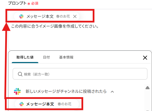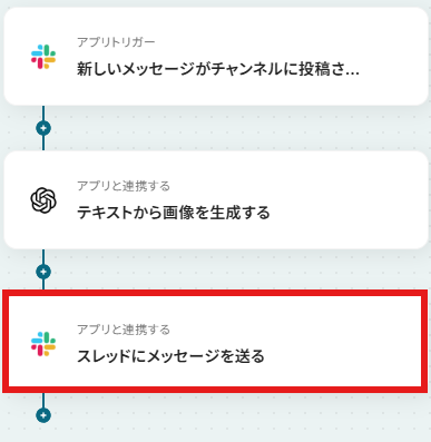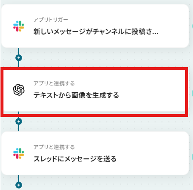 OpenAIの「テキストから画像を生成する」アクションでは、プロンプトにSlackの投稿内容だけでなく、特定のスタイルを指定するような固定のテキストを追加することも可能です。 Slackの「スレッドにメッセージを送る」アクションでは、生成された画像URLに加え、「画像が生成されました」といった固定メッセージや投稿者名などを動的に埋め込み、通知内容を自由にカスタムできます。 ■注意事項
