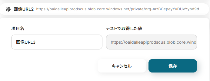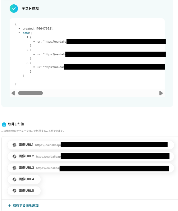 ここまで入力したらテストボタンをクリックしてください。テストが成功し、取得した値が入ります。 これで画像が生成されました。