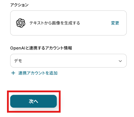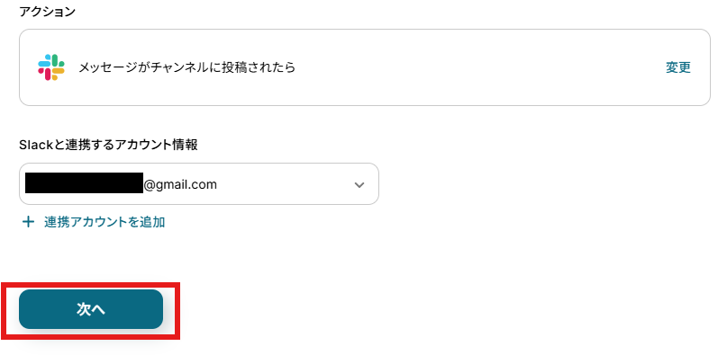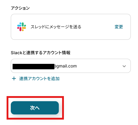 アクションはデフォルト設定のまま、アカウント情報は、連携したいアカウントが選択されているか確認してください。問題なければ「次へ」をクリックしましょう。