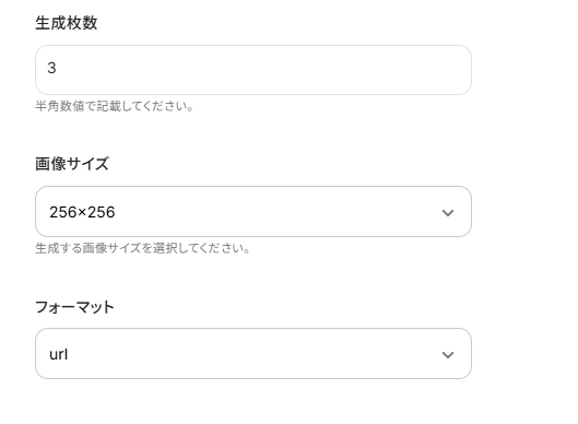 生成枚数、画像サイズ、フォーマットはデフォルトの通りにしてありますが、用途に合わせて変更してください。