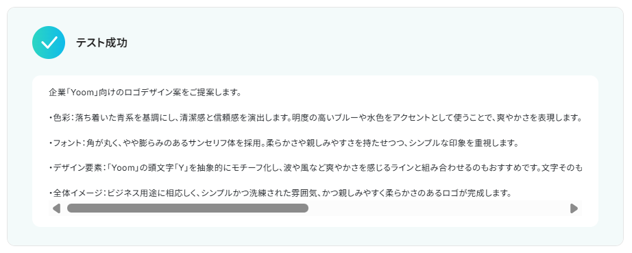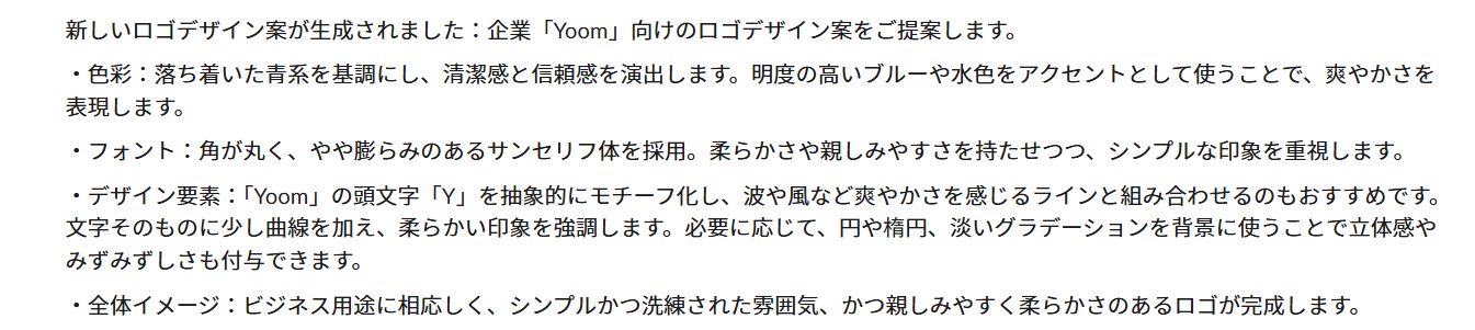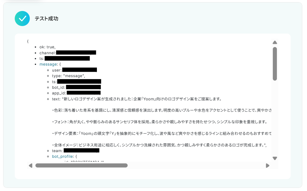 チャットツール上で特定のキーワードやコマンドを含んだメッセージが投稿されると、それをトリガーとしてAIがロゴデザイン案を生成し、同じチャットチャネルに自動で返信することもできます。