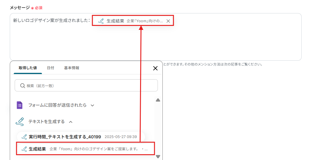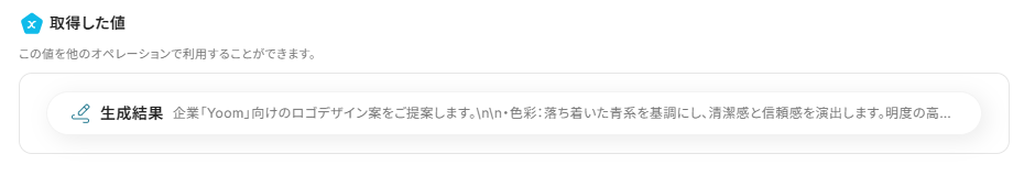 先程生成したテキストをここに引用していきます。取得した値から「生成結果」を入力してください。