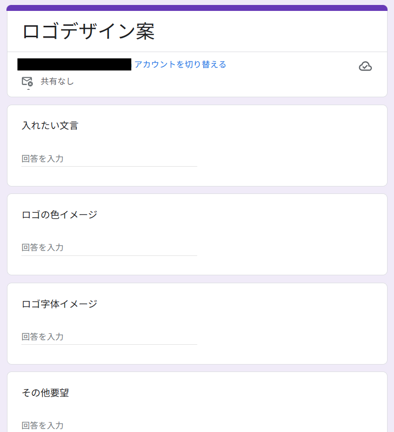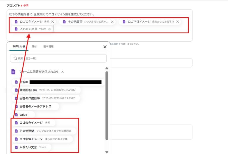 先程Google フォームから取得した値(ロゴデザインの要望)を入力しておきます。