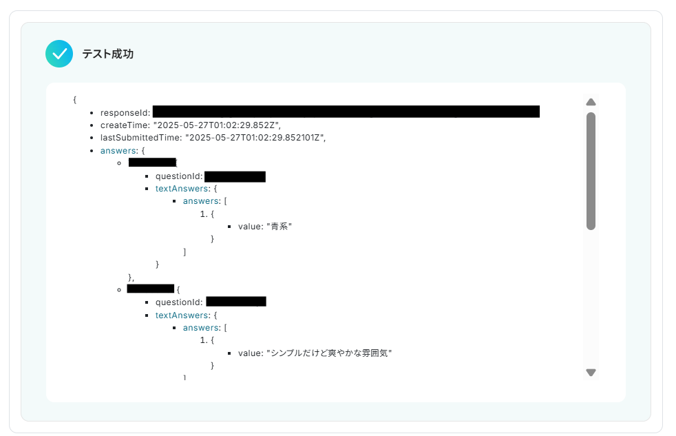 ・Googleフォームをトリガーとして使用した際の回答内容を取得する方法は下記を参照ください。