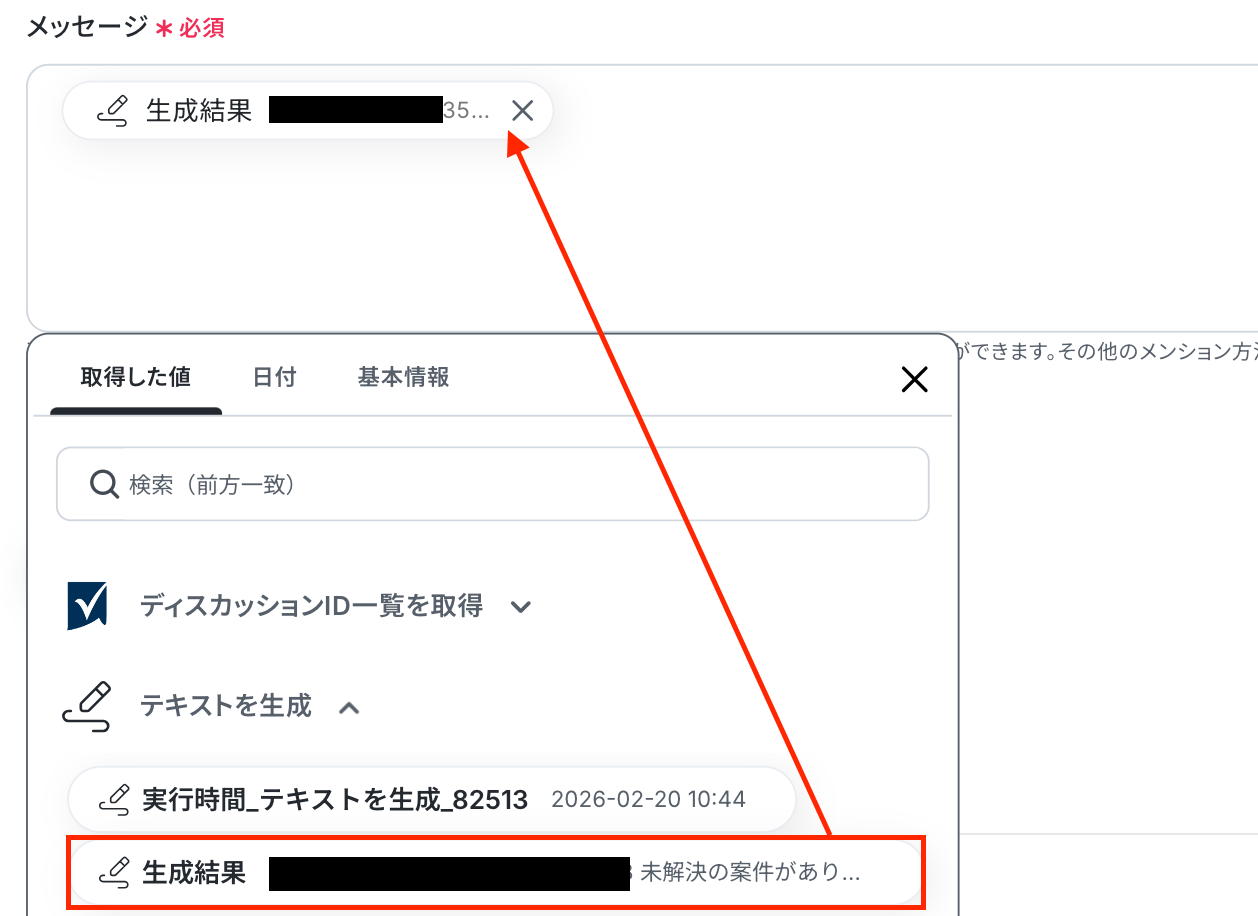 次に、「メッセージ」 を入力します。 以下のように、テキスト生成の設定で取得した値を引用して設定しましょう。 自由に設定してOKです!