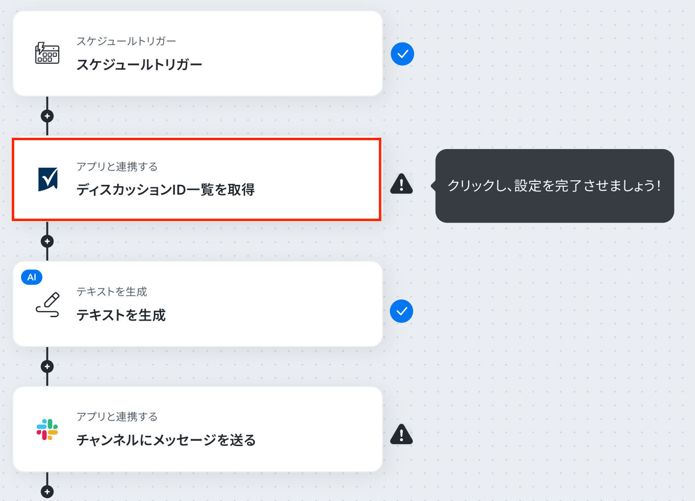 定期的にSmartsheetのディスカッションIDを取得して通知するフローを作ってみよう それではここから代表的な例として、定期的にSmartsheetでディスカッション一覧を取得し、その結果をSlackで担当者へ通知する フローを解説していきます!