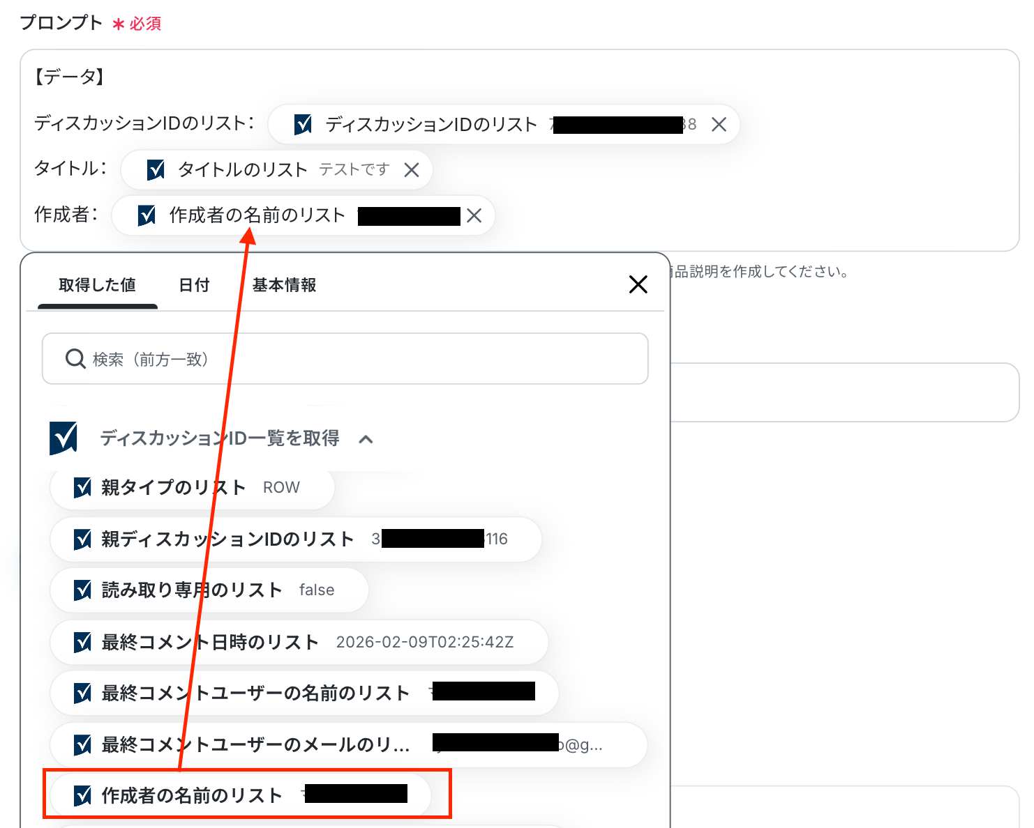 ここでは、AIでテキストを生成する際に使用するプロンプトを設定します。 今回はテンプレートを使用しているため既に設定されていますが、自由に設定することも可能です。 Smartsheetの設定で取得した値を組み合わせて設定してください。 取得した値は、入力欄をクリックすると表示されます!【Tips】 取得した値を活用することで、フローボットを起動する度に変動する値として反映されます。 これにより、毎回変動する情報を手動で入力する必要がなくなり、効率的に連携できます!