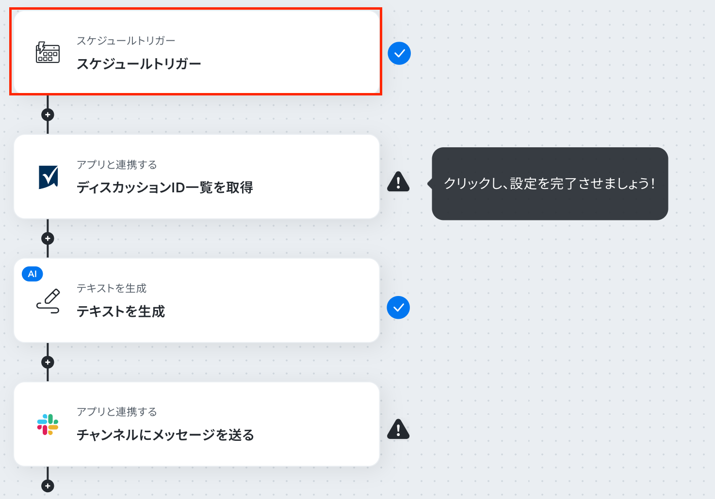 ステップ3:スケジュールトリガーの設定 最初の設定です。 ここから「定期的にSmartsheetでディスカッション一覧を取得し、Slackで担当者へ通知する」 フローの設定をしていきます! まずは赤枠をクリックしましょう! 詳細については、スケジュールトリガーの設定方法 を参考にしてください。