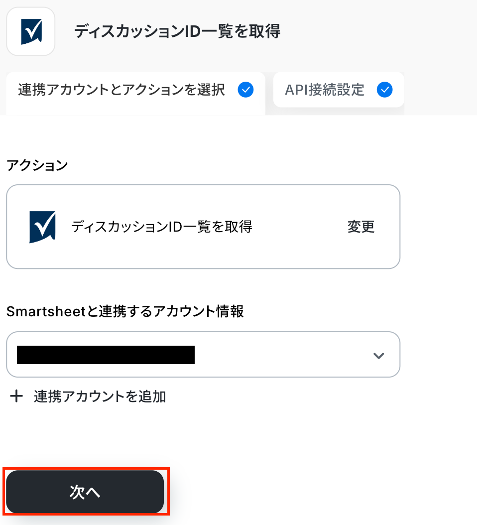 ステップ4:Smartsheetのアクション設定 ここでは、ディスカッションID一覧を取得する設定を行います。 赤枠部分をクリックしましょう!