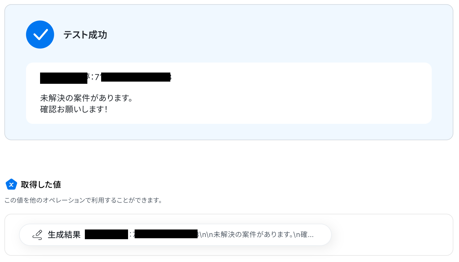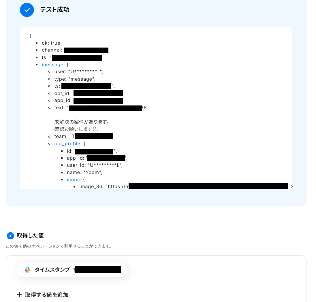 ※ 取得した値 とは? トリガーやオペレーション設定時に、「テスト」を実行して取得した値のことを指します。 後続のオペレーション設定時の値として利用でき、フローボットを起動する度に変動した値となります。