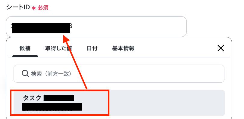 次の画面で、「シートID」 を設定します。 入力欄をクリックして表示される候補から選択してください。