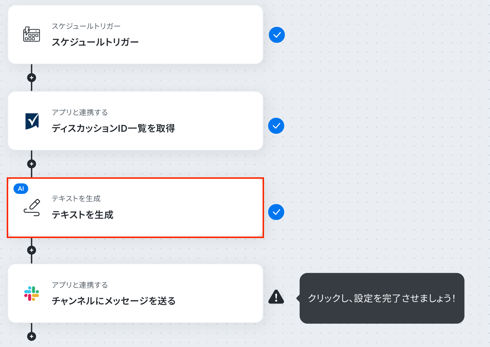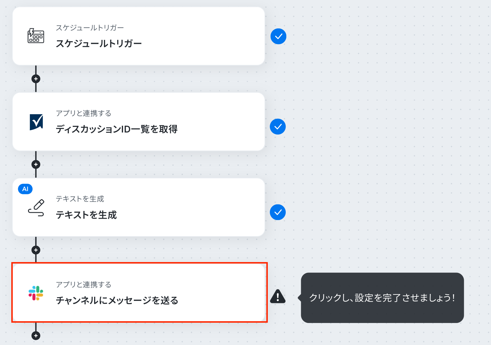 ステップ6:Slackのアクション設定 最後の設定です!ここでは、Slackに通知する設定を行います。 赤枠をクリックしましょう!