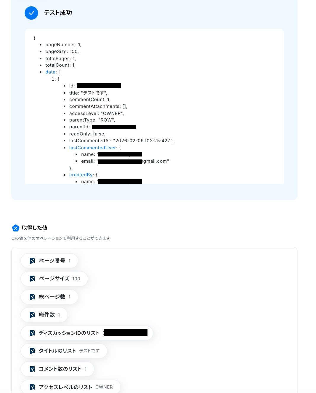 テストをクリックしましょう! テストに成功すると取得した値が表示されます。最後に「完了」をクリックしてください。