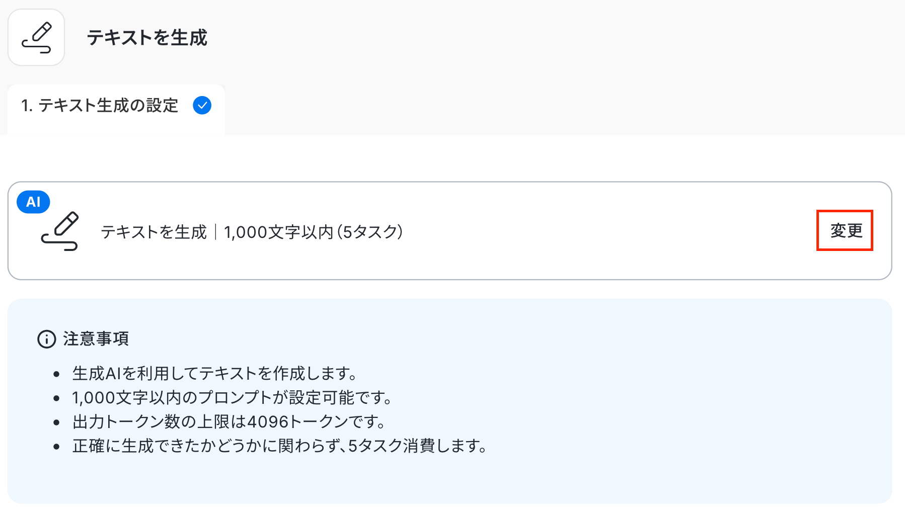 以下の画面が表示されるので、注意事項を確認しましょう。 「変更」をクリックすると、「指示可能なプロンプトの文字数」を変更できます。