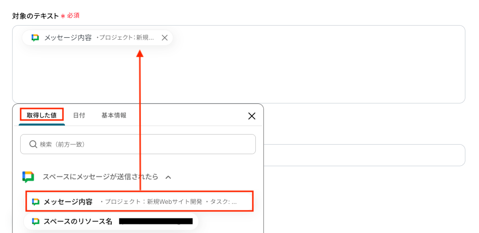 「対象のテキスト」を取得した値から選択してください。