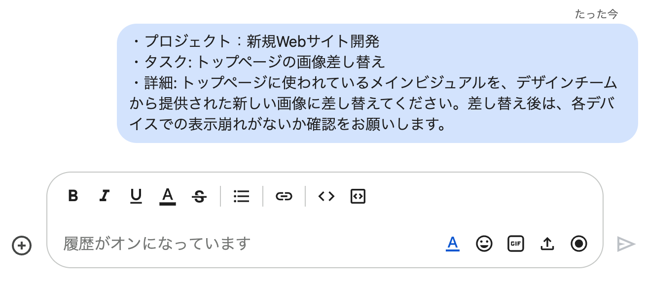 - テストを行う際は、トリガーとなるメッセージが必要です。以下のように、Google Chatでタスク化したいメッセージを送信してみてください。