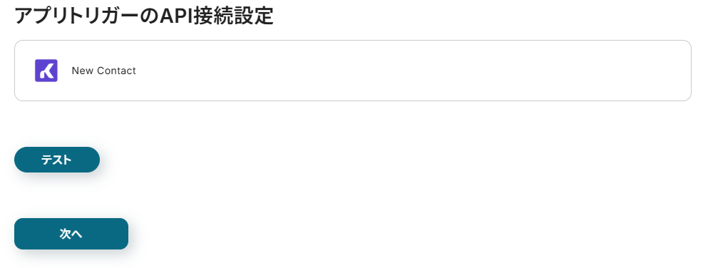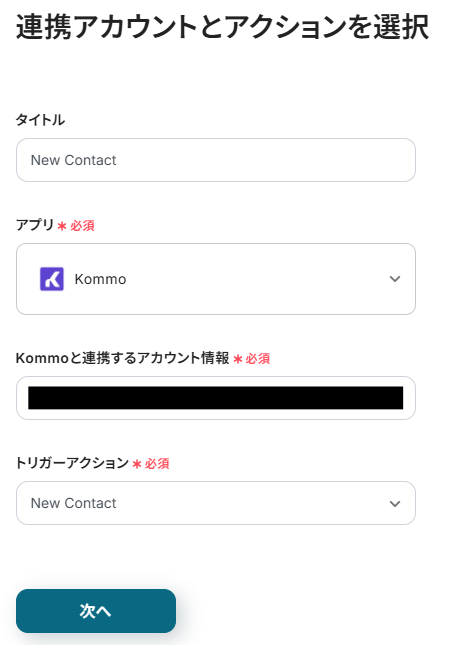 タイトルと連携するアカウント情報を任意で設定し、トリガーアクションはテンプレート通りに「New Contact」のまま「次へ」をクリックして進んでください。