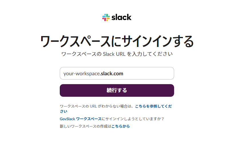 Slackのサインイン画面が表示されるため、連携させるワークスペースにサインインします。
