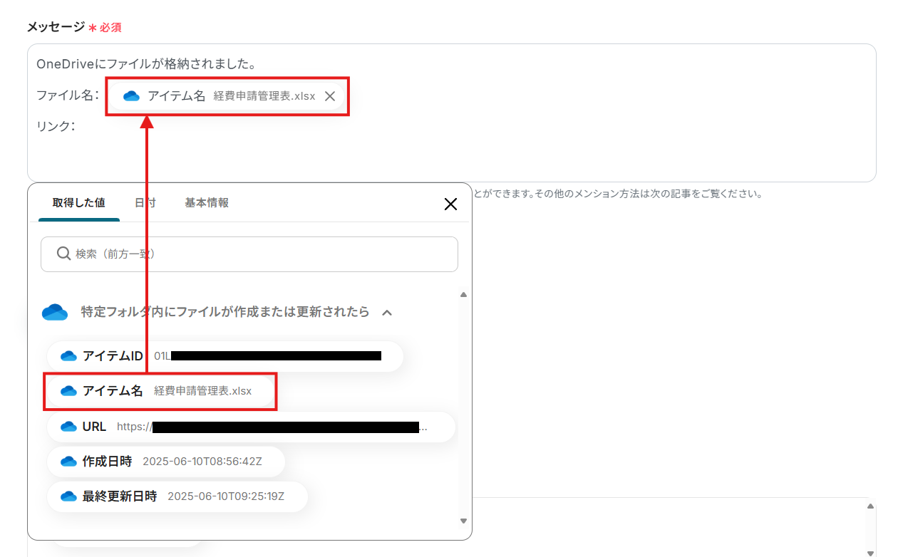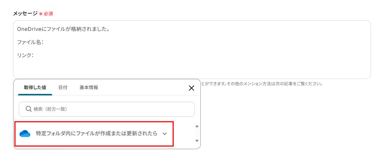入力欄クリック時に表示されるトリガーアクションメニューから、OneDriveから取得したファイル情報を選択できます。