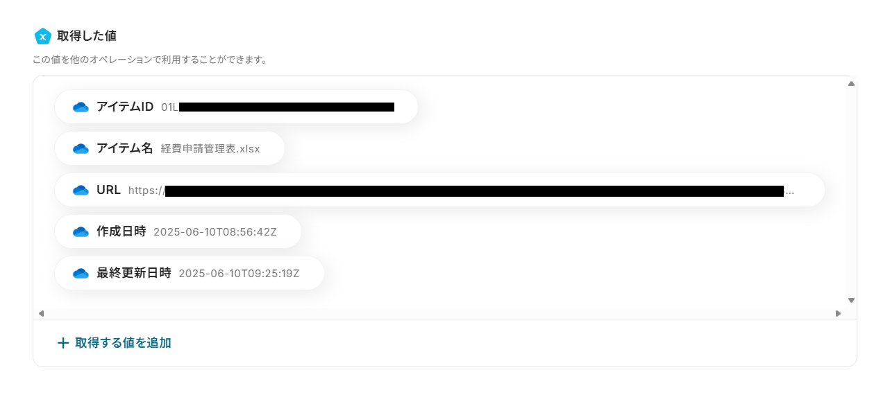 テストに成功すると、更新日が最も新しいファイルの情報「取得した値」に追加されます。