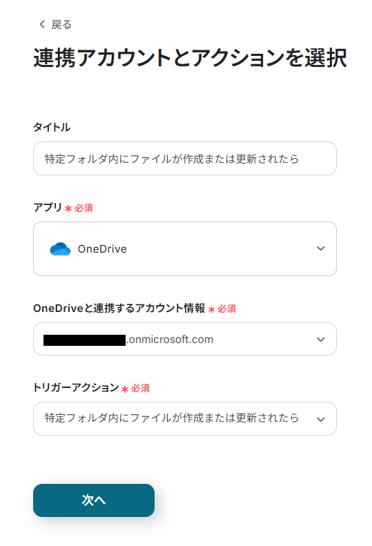 連携させるOneDriveに紐づくアカウントを入力し、「次へ」をクリック。