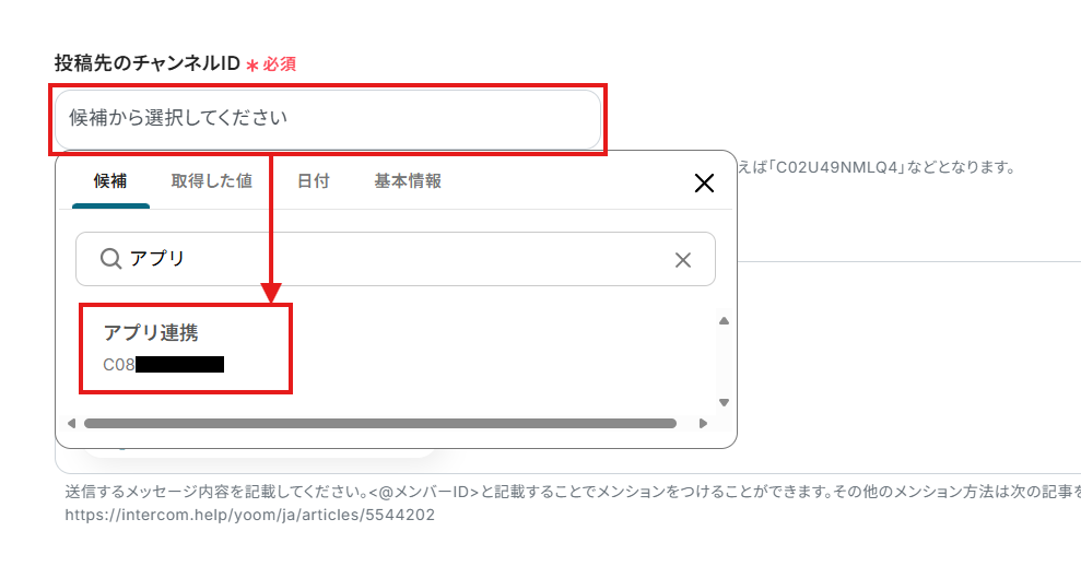 入力欄をクリックすると、連携しているSlackアカウントから候補が表示されるため、対象となるチャンネルを選択してください。