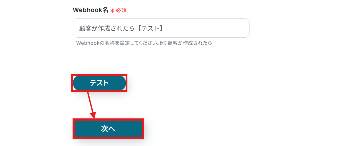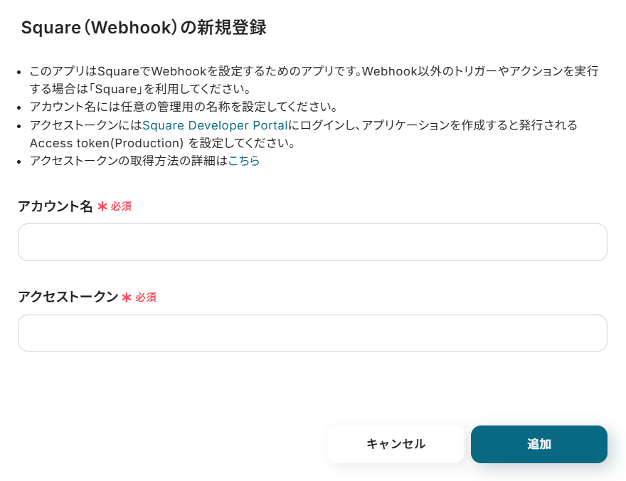 - Squareのトリガー設定では、どのワークフローかを識別するために任意のWebhook名を設定してください。