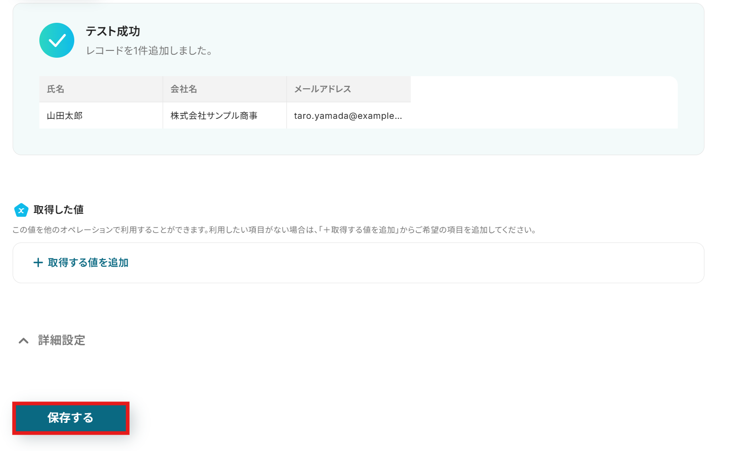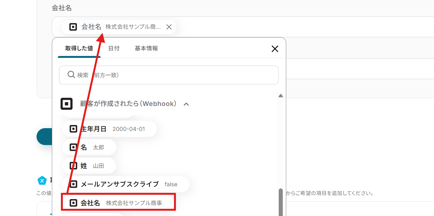 - Squareのトリガーで取得した顧客情報(会社名、氏名、メールアドレスなど)を変数として利用し、どの情報をSansanのどの項目に登録するかを自由にマッピングできます。