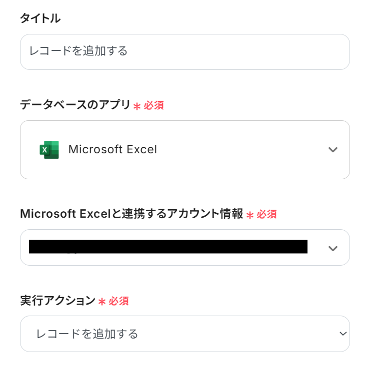 - 最後に、オペレーションとしてMicrosoft Excelを選択して「レコードを追加する」アクションを設定し、Squareから取得した顧客情報をMicrosoft Excelの指定したファイルに追加します。