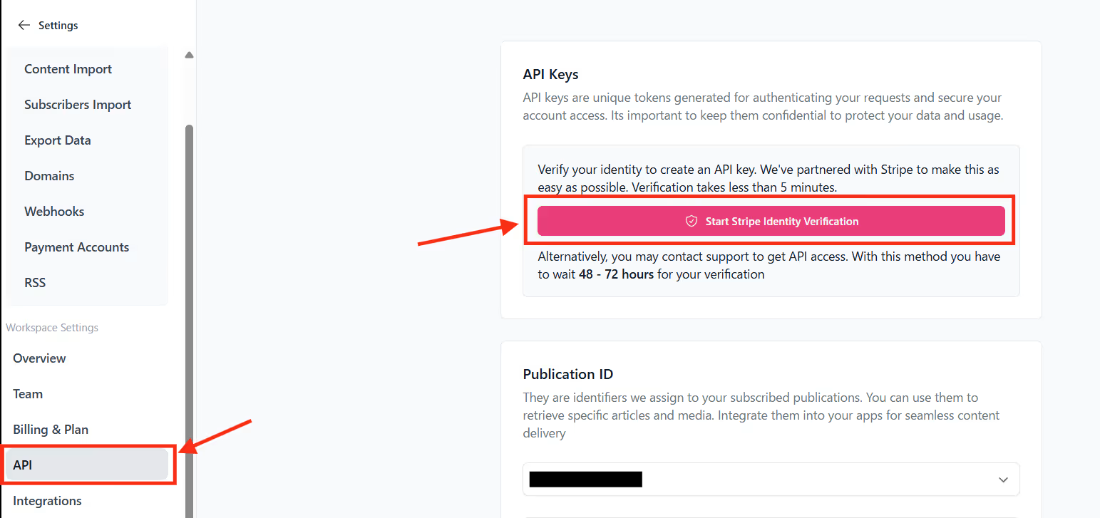 beehiivを開き、アクセストークンとPublication IDを取得しましょう。
