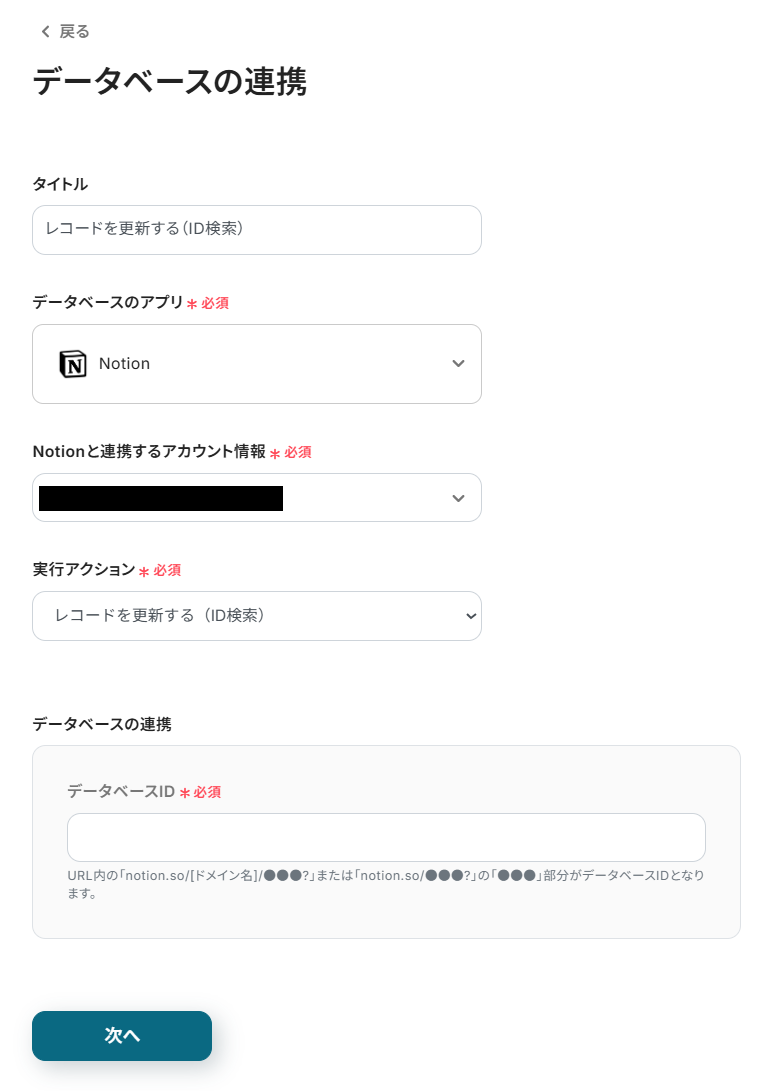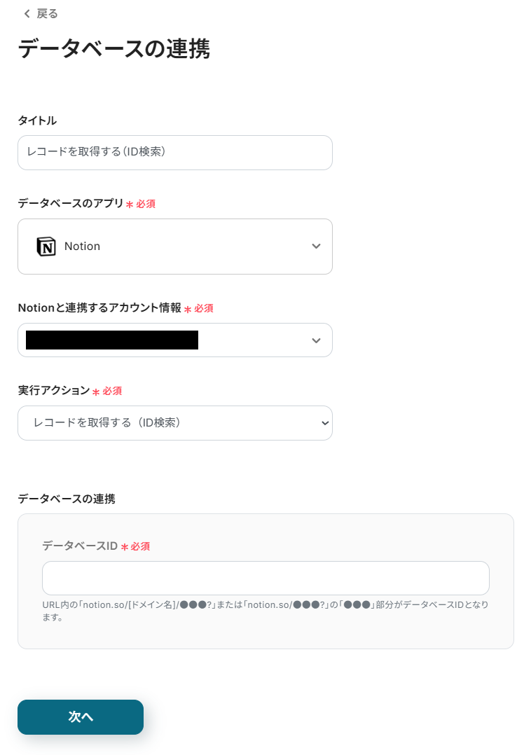 データベースIDに、ステップ3で指定したデータベースを設定して次へ進みます。