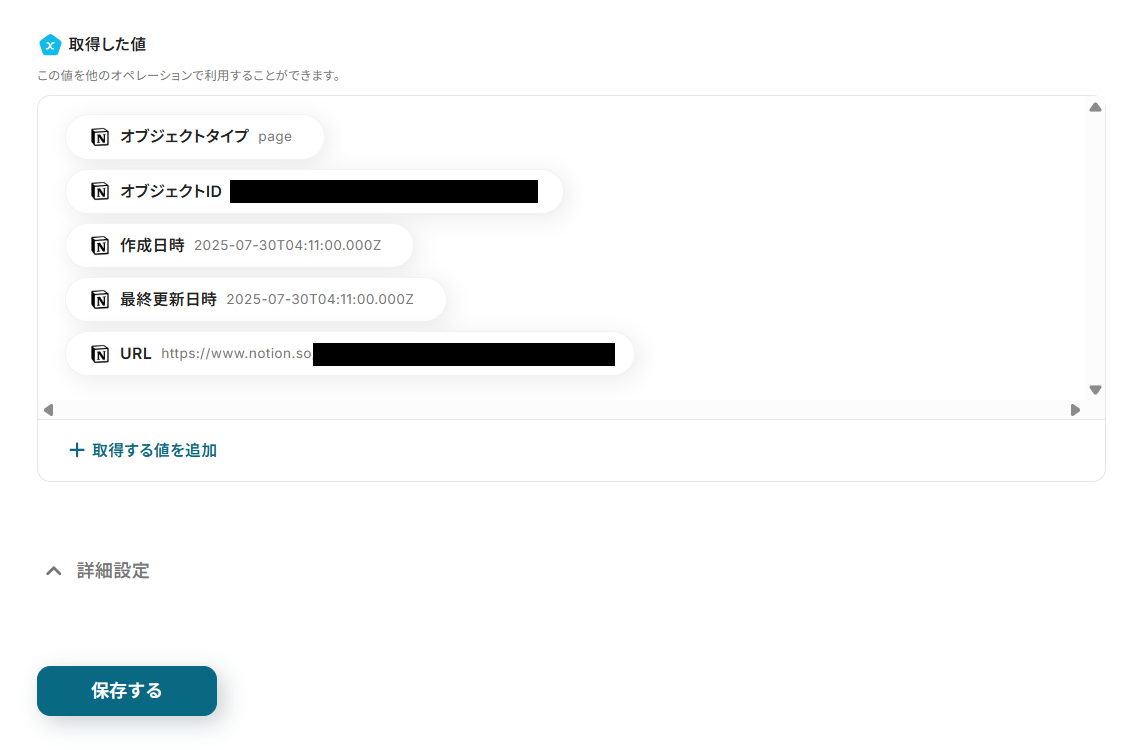 テストが成功すると、Notionの情報が取得されるので、確認して保存します。