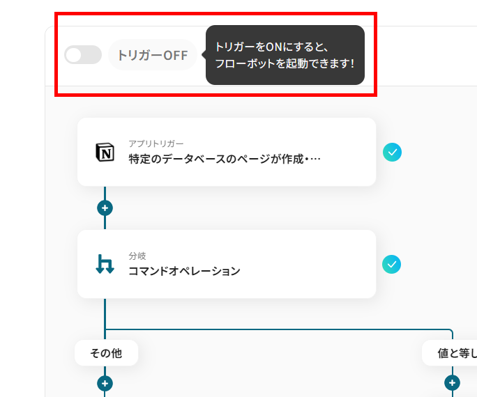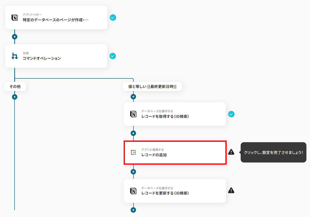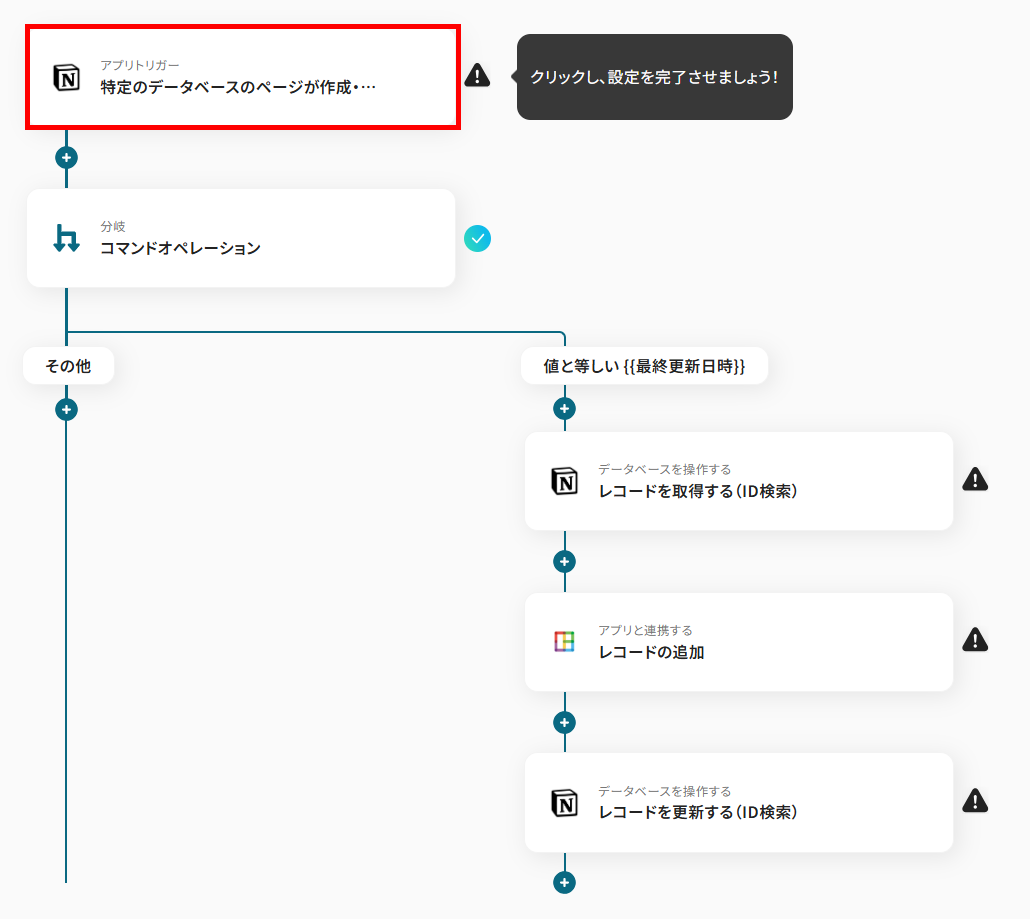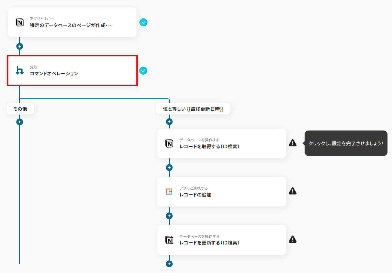 次に、Notionでのページの作成と更新で、後続の処理を分岐する設定を行います。 2番目の赤枠をクリックしてください。