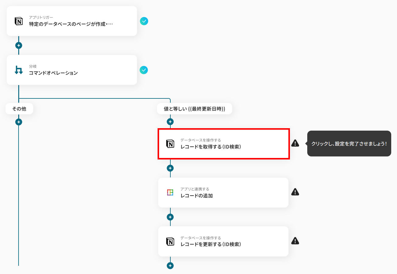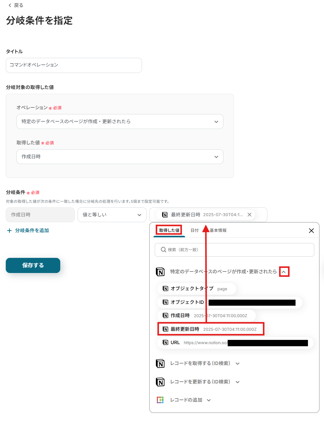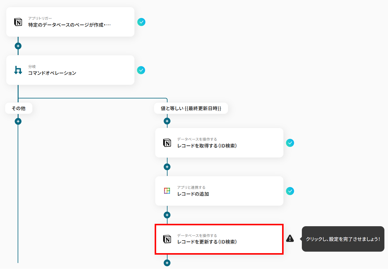 次に、Notionでのページの作成と更新で、後続の処理を分岐する設定を行います。 2番目の赤枠をクリックしてください。