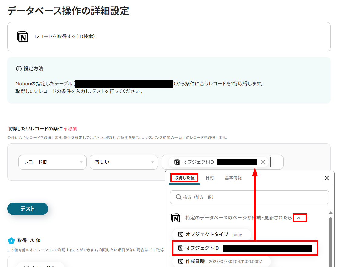 次に、Notionに登録したページの詳細情報を取得する設定を行います。 右列の1番上の赤枠をクリックしてください。