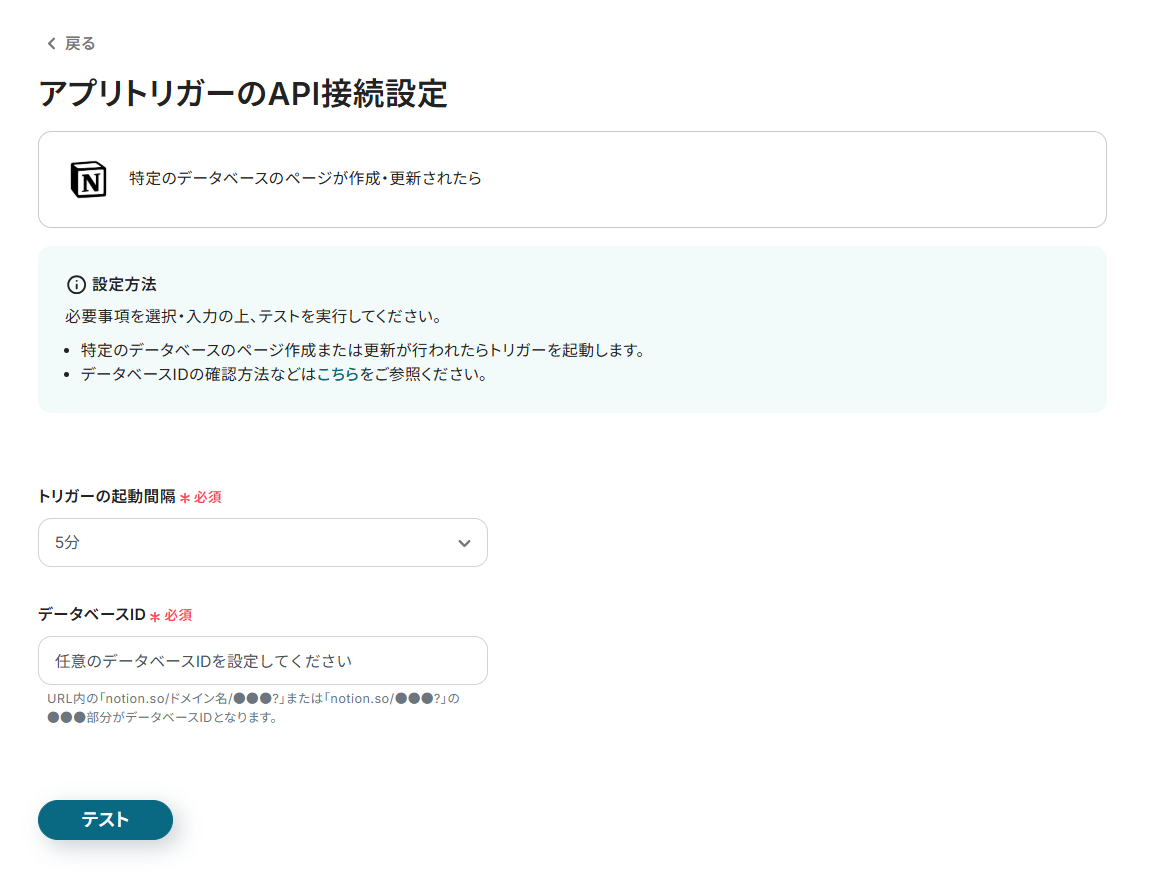 トリガーの起動間隔とデータベースIDを設定し、Notionにテスト用のページを作成してください。 ページを作成したらテストを行いましょう。