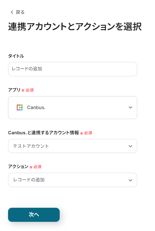 次に、Notionから取得した値を利用して、Canbus.にレコードを追加する設定を行います。 右列の真ん中の赤枠をクリックしてください。