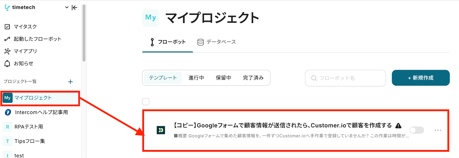 左側にあるメニューの「マイプロジェクト」から、コピーしたテンプレートを開きます。