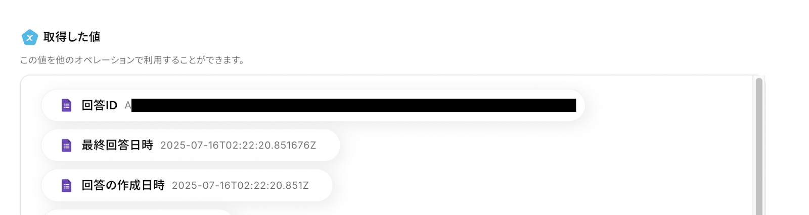 ・Googleフォームをトリガーとして使用した際の回答内容を取得する方法は下記を参照ください。https://intercom.help/yoom/ja/articles/6807133