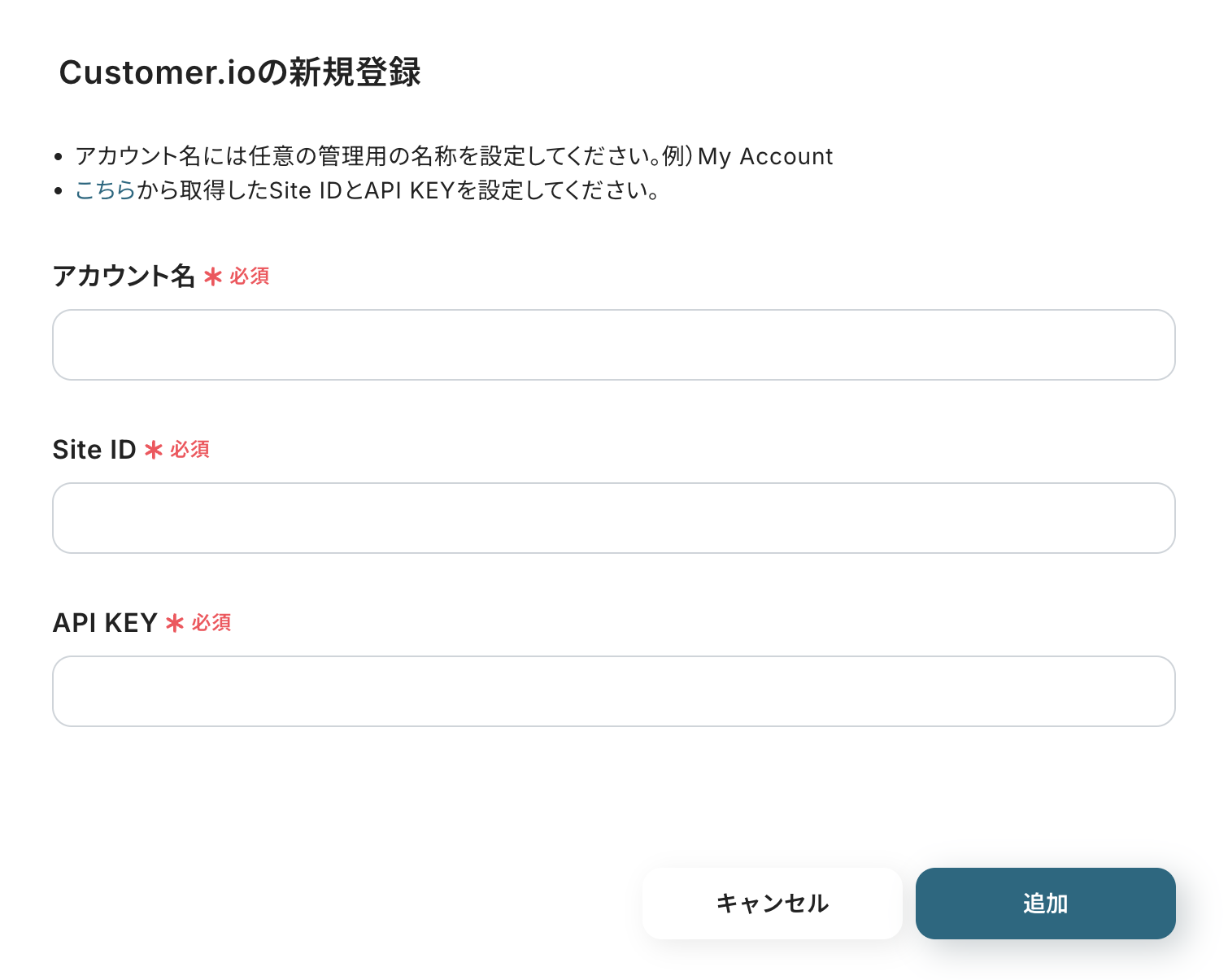Customer.ioを検索すると新規登録画面が表示されるので、「アカウント名」「Site ID」「API KEY」それぞれ入力したら連携完了です!