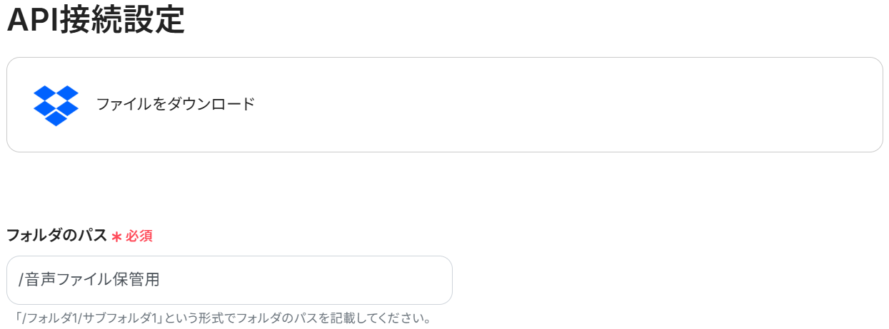 次に、先ほどファイルを格納したフォルダのパスを入力してください。今回でいうと「/音声ファイル保管用」です。