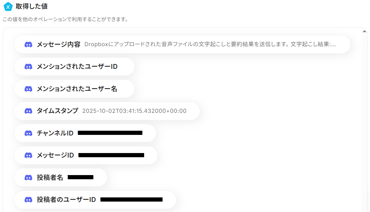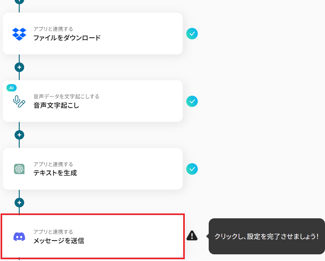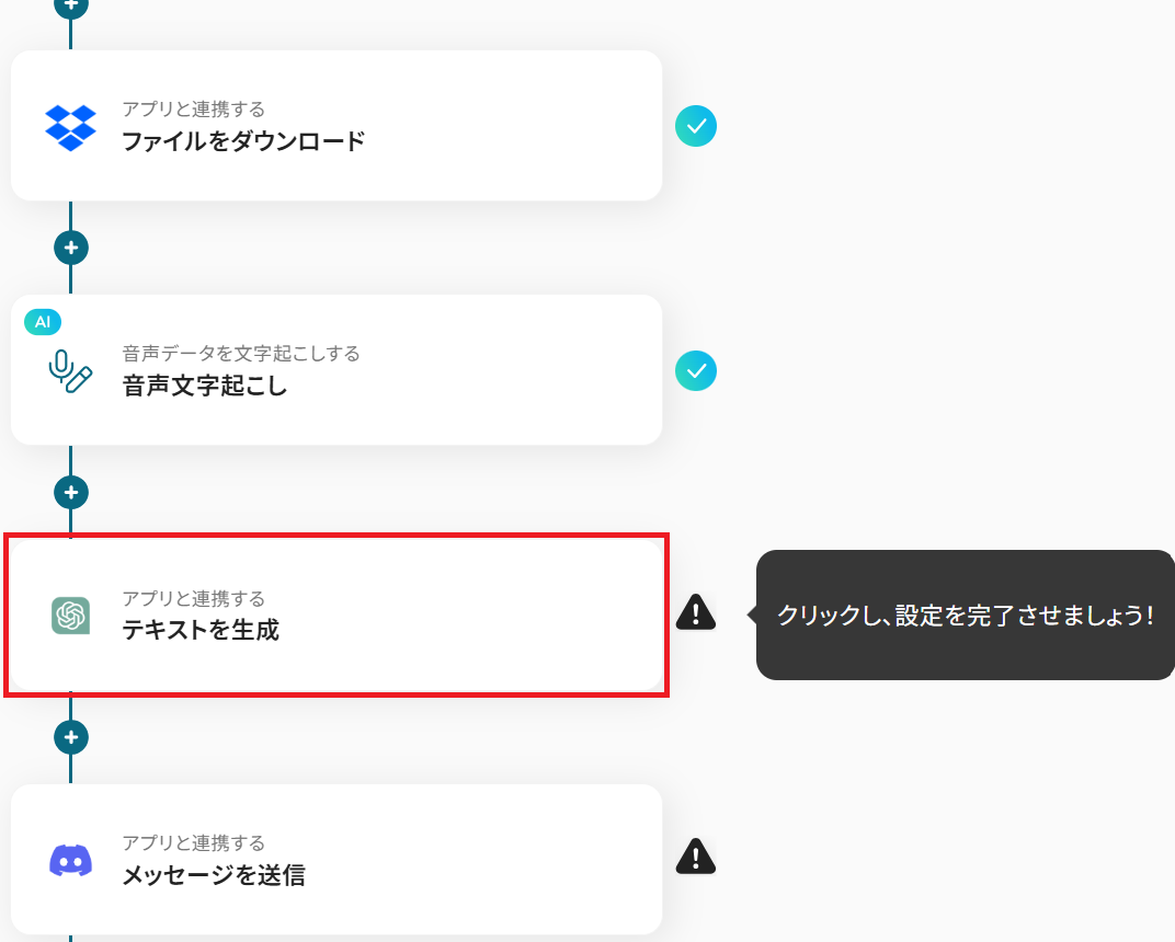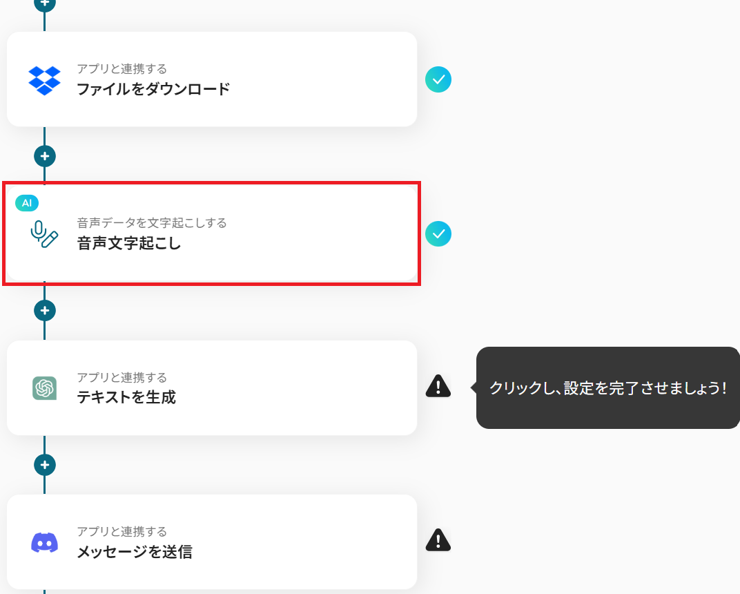 - Dropboxのトリガー設定およびアクション設定、文字起こし設定、ChatGPTのアクション設定、Discordのアクション設定