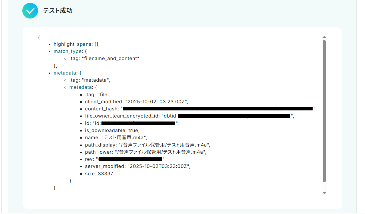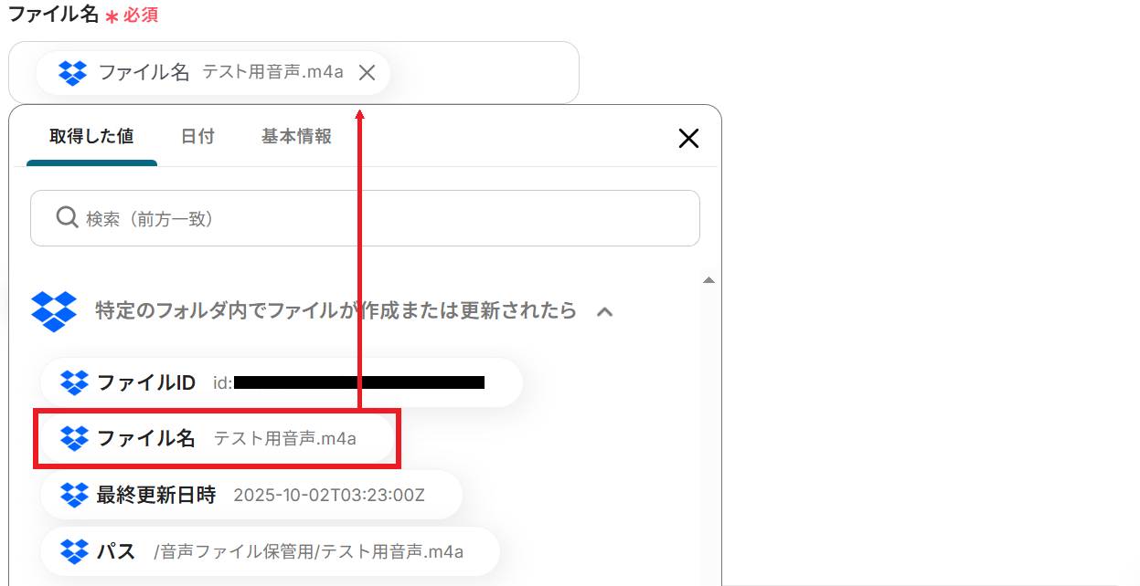 ファイル名の欄にはDropboxから取得した「ファイル名」の値が予め設定されているので、そのままテストしてください。