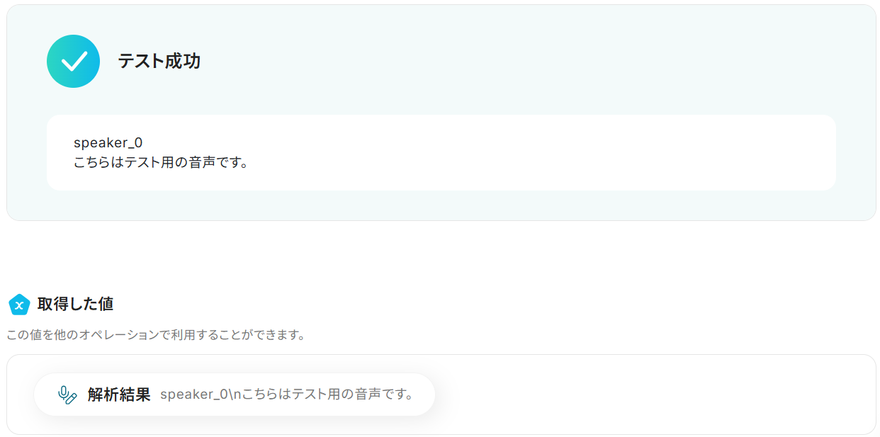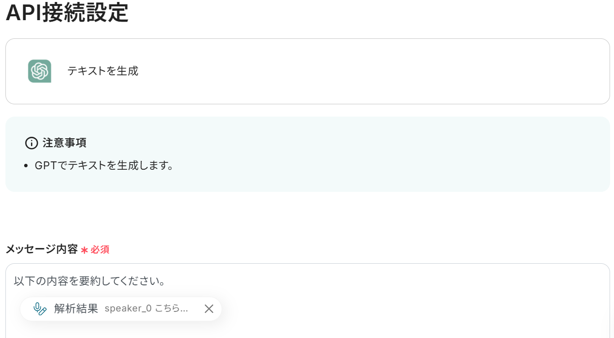 会議の議事録作成やインタビュー内容の整理といった作業にかかる時間を短縮できます。この連携はAIによるデータ抽出・加工処理を含んでおり、手動での確認や転記作業を削減します。