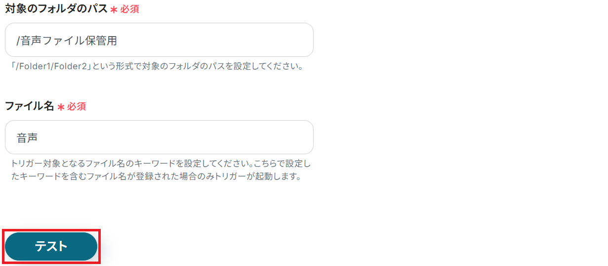最後に、トリガー対象となるファイル名のキーワードを入力しましょう。今回は「音声」というキーワードにしました。