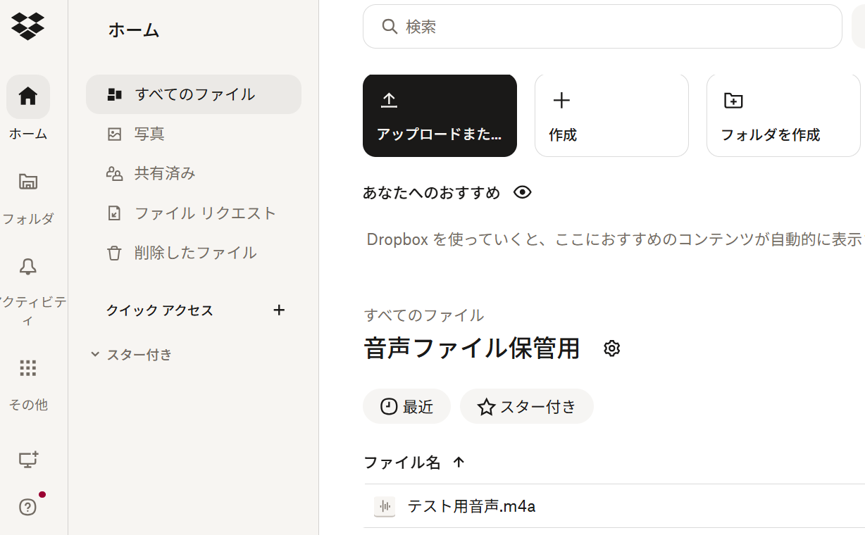 今回は例として「音声ファイル保管用」フォルダを作成し「こちらはテスト用の音声です」と吹き込んだm4aファイルをアップロードしました。