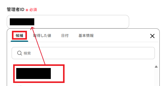 「管理者ID」は、入力欄をクリックして表示される候補から選択してください。 候補は、連携しているアカウントに紐づいて表示されます。