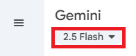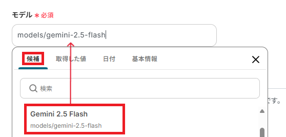 「モデル」は、Geminiのモデルタイプを入力します。 Geminiのページ左上を確認し、同じものをモデルとして設定しましょう。